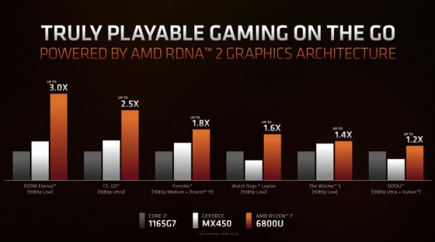 Интерес процессоры Rembrandt представляют не только новой архитектурой вычислительных ядер Zen 3+, но также и своими встроенными графическими ядрами на архитектуре RDNA2. К сожалению, в указанных тестах Geekbench не проводилась проверка производительности встроенной графики. В ходе анонса чипов серии Rembrandt компания AMD показала, что встроенная графика энергоэффективной модели Ryzen 7 6800U значительно быстрее решений конкурентов.