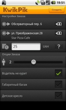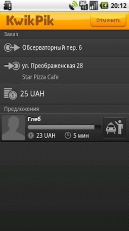 Мобильный сервис заказа такси KwikPik – теперь в Украине!KwikPik – мобильное приложение, позволяющее моментально установить связь «пассажир-водитель». Особенность услуги заключается в возможности клиента диктовать «правила игры». Установив приложение, пассажир указывает пункт назначения на карте либо через поиск (на основе технологии Foursquare). Затем сам указывает цену за проезд, либо выбирает его стоимость из вариантов, предложенных водителями. Кроме того, клиент по своему желанию отмечает на дисплее дополнительные требования: наличие детского кресла, места для габаритного багажа и возможность курить в салоне. Он видит, где находится такси в текущий момент времени, так что легко может рассчитать, сколько времени осталось до прибытия авто.
