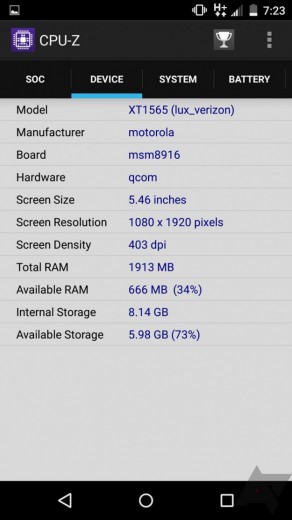 Motorola Droid Maxx 2 "засветился" на фото и программе CPU-ZВ Сети опубликовали первые живые фотографии не представленного еще официально смартфона компании Motorola Droid Maxx 2, а также скриншоты программы CPU-Z с его техническими характеристиками.