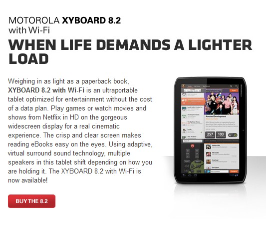 Motorola DROID XYBOARD 10.1 и Motorola DROID XYBOARD 8.2 доступны для предварительного заказаДля тех, кто уже заказал Motorola DROID XYBOARD 10.1 или Motorola DROID XYBOARD 8.2 могли уже получить уведомление о том, что девайсы им уже отправлены. С этой недели информация о Motorola DROID XYBOARD 10.1 и Motorola DROID XYBOARD 8.2 наконец-то появилась и на официальном сайте компании. Планшетники доступны с 16 и 32 Гб встроенной памяти, в частности Motorola DROID XYBOARD 10.1 стоит 499,99 и 599,99 долларов за 16 и 32 Гб соответственно. В то время как Motorola DROID XYBOARD 8.2 оценен в 399,99 и 499,99 долларов.
