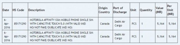 Motorola готовит к анонсу новый 5-дюймовый смартфон Moto EВ базе данных индийского логистического веб-сайта Zauba засветился не представленный еще официально смартфон Moto E третьего поколения под кодовым названием "Affinity". Фрагмент документа информирует о том, что тестовый экземпляр устройства прибыл из Канады в Индию 6 апреля на тестирование, оснащен дисплеем диагональю 5 дюймов и поддержкой лишь одной сим-карты.