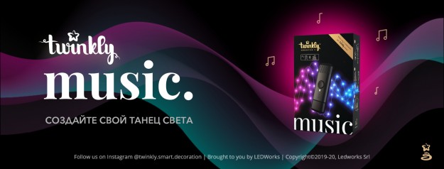 Бренд Twinkly с гордостью сообщает о запуске Twinkly Music. Это USB устройство, которое питается от электросети и предоставляет владельцам возможность включить декор освещения Twinkly синхронно с любым музыкальным источником (например, смартфон, компьютер и т.д.) и создать захватывающее освещения.