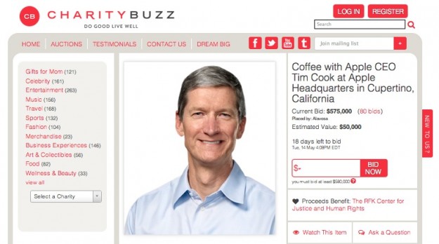 На аукционе Charitybuzz продается встреча с Тимом КукомСтало известно о том, что на популярном аукционе Charitybuzz на торгах продается встреча с нынешним CEO компании Apple Тимом Куком. Но кто бы мог подумать, что стоимость этого лота уже превысили полмиллиона долларов, и надо полагать, что перед нами еще далеко не окончательная сумма ($575 тыс.). И это только за получасовой разговор «за чашкой кофе». Отметим, что эта стоимость встречи с Куком уже превысила предыдущий рекорд торгов за право встречи с Биллом Клинтоном, экс-президентом США ($225 тыс.)