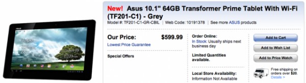 Но на этой неделе на Best Buy появился Asus Transformer Prime на 64 Гб, только тираж его ограничен, зато цена не так сильно отличается от 32 Гб и составляет 599,99 долларов.