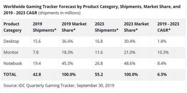 По итогам 2019 года в целом объём рынка игровых компьютеров и мониторов, по прогнозам IDC, достигнет 42,8 млн единиц. Из них 19,4 млн, или 45,3 %, составят ноутбуки. Ещё 15,6 млн штук (36,4 %) придётся на настольные системы. Поставки мониторов окажутся на уровне 7,8 млн штук (18,3 %). Джерело: 3DNews.ru Обговорення новиниКоментариев пока никто не оставил. Станьте первым! Попередні новини