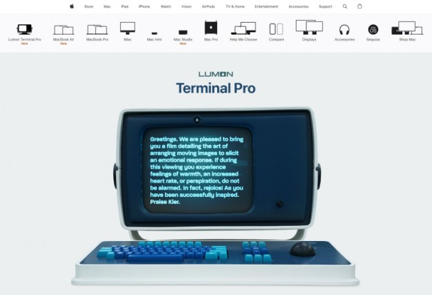 На основній сторінці з комп'ютерами серії Apple Mac згадка комп'ютера Lumon Terminal Pro відсутня, але він є в навігаційному підменю розділу. Можливості купити цей комп'ютер Apple, звісно ж, не пропонує, а сторінка Lumon Terminal Pro містить посилання на відео, в якому розповідається про процес монтажу останньої серії одного з найнезвичайніших серіалів, що вийшли в останні роки.