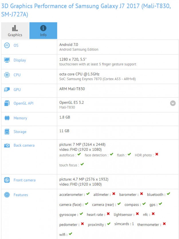 На сайте GFXBench засветились спецификации Samsung Galaxy J7 (2017)В базе данных тестера GFXBench засветился не анонсированный еще смартфон Samsung Galaxy J7 (2017), благодаря чему стали известны основные технические характеристики будущей новинки южнокорейского производителя.