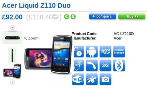 Начались продажи 175-долларового смартфона Acer Liquid Z110 DuoНа территории Великобритании стартовали продажи нового Android-смартфона от тайванской Acer, модели Acer Liquid Z110 Duo. Анонс новинки, напомним, состоялся несколько месяцев назад в Гонконге. Данный аппарат представляет собой достаточно доступный dual-SIM Android-смартфон под управлением операционной системы Android 2.3, 256 МБ оперативной памяти, а также гигагерцового, разумеется, одноядерного процессора.