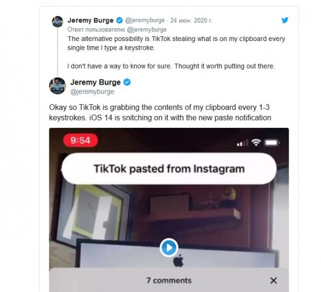 Наглый шпионаж: Apple застала TikTok и другие приложения врасплохНедавно представленная бета-версия iOS 14 привнесла на устройства Apple множество долгожданных изменений, однако не обошлось и без нескольких скрытых от глаз обывателя нововведений. Помимо жестового управления по касанию задней панели, купертиновские разработчики добавили функцию отслеживания обращений сторонних приложений к буферу обмена устройства, в котором могут храниться как безобидные фрагменты текстовых сообщений пользователя, так и конфиденциальные данные, геометки, пароли, номера счетов и многое другое.