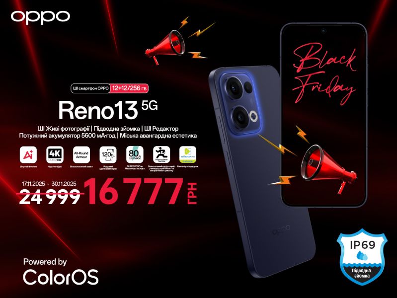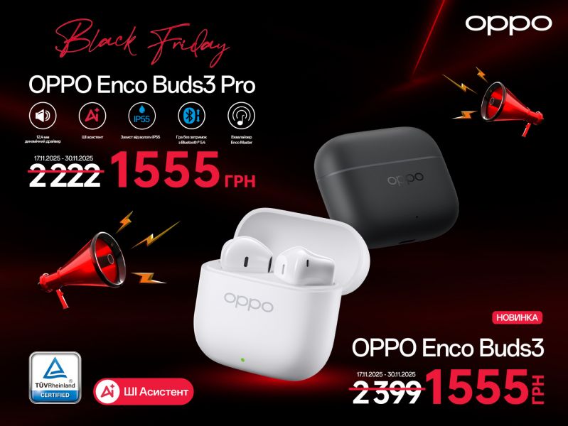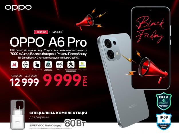 Найчорніша п'ятниця від OPPO: забирай топ-гаджети за найкращою ціноюНаймасштабніший розпродаж року вже стартує. OPPO AED Україна підготувала вражаючі пропозиції на фірмові смартфони, планшети, навушники та інші смарт пристрої. У період Black Friday на вас чекають спеціальні ціни, щоб ви могли вигідно оновити техніку та обрати ідеальні подарунки до зимових свят. NEW! OPPO A6 Pro оснащений батареєю на 7000 мАг та захистом IP69, що гарантує стійкість до пилу, води та механічних впливів. AMOLED-дисплей 6,57" з ультратонкою рамкою із частотою 120 Гц забезпечує яскраве та плавне зображення, а система Trinity Engine разом із Luminous Rendering Engine у ColorOS 15 підтримує стабільну продуктивність навіть у багатозадачності. Основна камера 50 Мп із підтримкою ШІ-обробки фото забезпечує деталізовані знімки у будь-яких умовах, а фронтальна камера 8 Мп підходить для якісних селфі та відеозв?язку. Корпус ОРРО A6 Pro має посилену середню рамку з алюмінієвого сплаву OPPO AM04, який захищає внутрішні компоненти від деформації, а дисплей має міцне скло AGC DT-Star D+ з покращеною стійкістю до подряпин і ударів. NEW! OPPO A6 Pro (8/256 ГБ) + спеціальна комплектація для України – надшвидкий зарядний пристрій 80Вт та фірмовий чохол – звичайна ціна 12999 грн. Акційна ціна 9999 грн (17/11-30/11). OPPO Reno13 має 6,7-дюймовий OLED-дисплей з роздільною здатністю 1,5K, частотою 120 Гц і співвідношенням екрану до корпусу 93,4%. Завдяки захисту IP69 смартфон витримує занурення у воду на глибину до 2 м, підтримує підводну зйомку без чохла та має окремий режим підводної камери. Основна камера — 50 Мп, селфі — 50 Мп, відео 4K з обох боків. AI-інструменти — Clarity Enhancer, Unblur, Reflection Remover — допомагають покращити фото, а функція AI Motion оживляє зображення. Смартфон працює на 4-нм процесорі MediaTek Dimensity 8350, має ефективну систему охолодження та ігрову оптимізацію AI HyperBoost. Акумулятор 5600 мАг підтримує зарядку SUPERVOOC 80 Вт і зберігає 80% ємності навіть через 5 років. ОРРО Reno13 (12/256ГБ) звичайна ціна 24999 грн. Акційна ціна 16777 грн (17/11-30/11). ОРРО Reno13FS (12/512ГБ) звичайна ціна 19999 грн. Акційна ціна 15555 грн (17/11-30/11). ОРРО Reno13F 4G (8/512 Гб) звичайна ціна 14999 грн. Акційна ціна 12777 грн (17/11-30/11). OPPO A5 Pro має 6,67-дюймовий яскравий IPS екран з частотою 120 Гц і піковою яскравістю 1000 ніт. Завдяки захисту IP69, IP68 та IP66, смартфон витримує занурення у воду, високий тиск і пил, а також має сертифікат ударостійкості та скло Gorilla Glass 7i. Смартфон працює на процесорі MediaTek Dimensity 6300, має 8 ГБ оперативної та 256 ГБ вбудованої пам’яті. Акумулятор 5800 мАг підтримує швидку зарядку 45 Вт: 30% за 19 хвилин. Смартфон оснащено основною камерою на 50 Мп, а також фронтальною на 8 Мп. Є режими зйомки під водою, ШI-ретуш, усунення відблисків і розмиття. Завдяки стереодинамікам і Ultra Volume Mode гучність збільшується до 300%. OPPO A5 Pro підтримує режим роботи в рукавичках, ігрову оптимізацію GameBoost та тримає продуктивність до 4 років завдяки системі Trinity Engine. ОРРО A5 Pro (8/256 ГБ) звичайна ціна 9299 грн. Акційна ціна 7555 грн (17/11-30/11)+ спеціальна комплектація для України – надшвидкий зарядний пристрій 45Вт та фірмовий чохол. ОРРО A5 Pro (8/128 ГБ) звичайна ціна 8499 грн. Акційна ціна 7444 грн (17/11-30/11)+ спеціальна комплектація для України – надшвидкий зарядний пристрій 45Вт та фірмовий чохол. ОРРО A5 Pro 5G (8/256 ГБ) звичайна ціна 9999 грн. Акційна ціна 8999 грн (17/11-30/11). Універсальний планшет OPPO Pad SE з 11-дюймовим яскравим IPS екран (500 ніт), 4 динаміками з підтримкою Hi-Res Audio та батареєю на 9340 мАг, яка забезпечує до 11 годин відео 