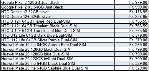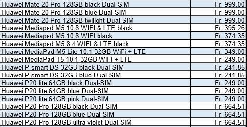 Цены в списке приведены оптовые и в швейцарских франках. В пересчёте по текущему курсу, смартфон Huawei Mate 20 обойдётся ритейлерам в 805 долларов, а в розницу выйдет по цене 850-900 долларов. Закупочная стоимость Mate 20 Pro для ритейлеров составила 1010 долларов, розничная цена окажется дороже на 50-100 долларов, то есть пользователям он обойдётся в 1050-1100 долларов.