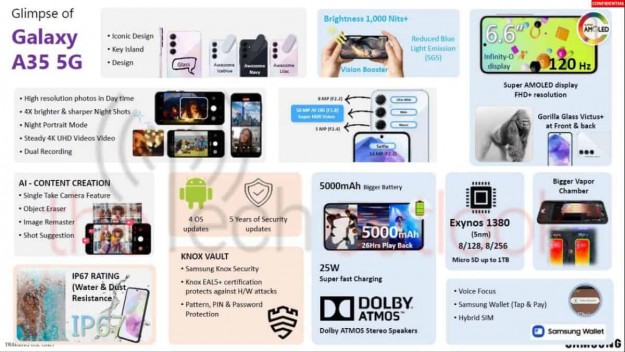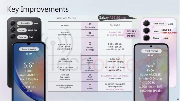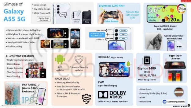Ресурс The Tech Outlook опублікував інфографіку, на якій наочно показано відмінності майбутнього Samsung Galaxy A55 від нинішнього Samsung Galaxy A54. Друга картинка демонструє відмінності Galaxy A35 і Galaxy A34. Також окремо наводяться зображення з докладними характеристиками Galaxy A55 і Galaxy A34.