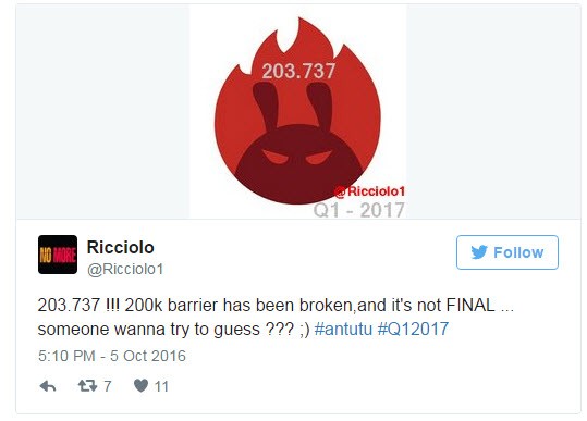 Неизвестное устройство установило новый рекорд AnTuTu в 203 737 балловTwitter-аккаунт @Ricciolo сообщил о том, что рекорд Apple iPad Pro в 177 тысяч баллов в бенчмарке AnTuTu побил неизвестный девайс, набравший в тестере 203 737 "попугаев".