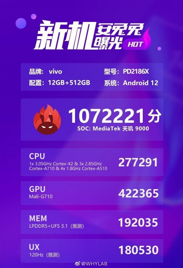 Неизвестный флагман Vivo показал мощь Dimensity 9000 в AnTuTuС момента анонса MediaTek Dimensity 9000 прошло вот уже три месяца и на этой неделе, наконец, чипсет дебютирует в OPPO Find X5 Pro. Ещё одной ближайшей новинкой с ним основе обещает стать одна из моделей флагманских моделей Vivo – предположительно, из серии X80. Дело в том, что в Сети всплыл скриншот AnTuTu-замера некой новинки Vivo под кодовым обозначением PD2186X с Dimensity 9000 в основе. Аппарату удалось набрать 1 072 221 балл, что стало рекордом среди всех протестированных до этого момента смартфонов на этом чипе – даже больше, чем приводила сама MediaTek в качестве примера. Нельзя не отметить и то, что девайс оснащён внушительной памятью 12/512 ГБ, 120-Гц экраном и работает на базе Android 12. Чем ещё впечатлит новинка Vivo – наверняка узнаем уже очень скоро.