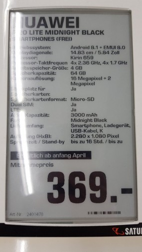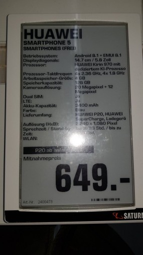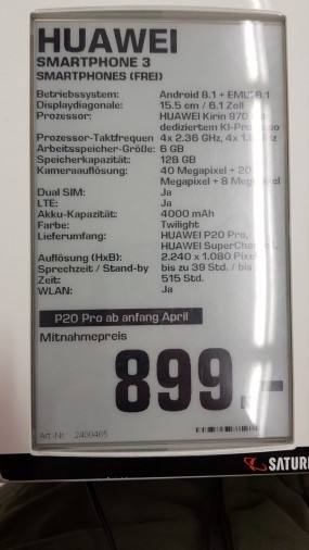 В сети появились фотографии с описанием характеристик готовящихся к выпуску смартфонов Huawei P20 и Huawei P20 Pro, пока не представленных производителем. Их источником стал немецкий ритейлер Saturn.