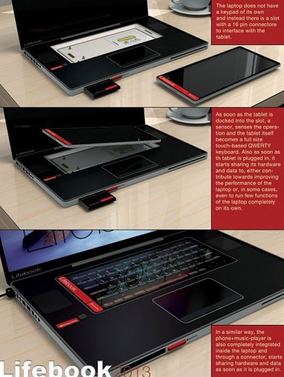 Необычный концепт Fujitsu Lifebook. Что скажут пользователи?Компания Fujitsu анонсировала новый концепт под названием Fujitsu Lifebook. Клавиатура Lifebook представляет собой встроенный планшет, представляющий собой полноразмерную клавиатуру с сенсорными кнопками. Вытащив ее вы получите полнофункциональный планшет.