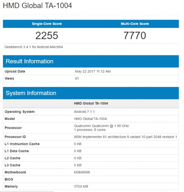 Готовящийся к анонсу флагман Nokia 9 с модельным номером HMD Global TA-1004 прошел тестирование производительности в популярном бенчмарке Geekbench, где установил новый рекорд. В режиме однопоточного тестирования Geekbench смартфон показал результат в 2255 баллов, а в многопоточном набрал рекордные для тестера 7770 баллов. При этом среди спецификаций предполагаемого Nokia 9 в базе данных бенчмарка значится чипсет Qualcomm Snapdragon 835 и 4 ГБ оперативной памяти. В качестве программной платформы указана операционная система Android 7.1.1 Nougat. Официальный анонс Nokia 9, напомним, ожидается в третьем квартале 2017 года.