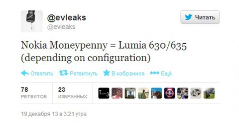 Nokia готовит к анонсу Lumia 630/635 и Asha 230Известный своими публикациями о неанонсированных устройствах twitter-аккаунт @evleaks на своей страничке в сервисе микроблогов сообщил, что мобильные устройства компании Nokia, известные под кодовыми именами "Moneypenny" и "Spinel", выйдут на рынок как Lumia 630/635 и Asha 230.