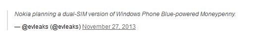 Nokia готовит к анонсу WP8.1-смартфон «Moneypenny» с поддержкой dual-SIMИзвестный своими публикациями о неанонсированных устройствах twitter-аккаунт @evleaks на своей страничке в сервисе микроблогов сообщил о том, что компания Nokia готовит к анонсу смартфон линейки Lumia с поддержкой режима dual-SIM. Новинка станет второй версией таинственной модели с кодовым названием «Moneypenny», о существовании которой в начале месяца проинформировал все тот же @evleaks.