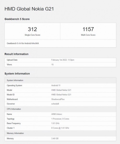 Nokia готовит к запуску доступный смартфон G21 на чипе UNISOCNokia готовит преемника представленному в мае прошлого года доступному смартфону G20. Новый Nokia G21 был замечен в базе данных бенчмарка Geekbench, благодаря чему стали известны ключевые характеристики устройства.