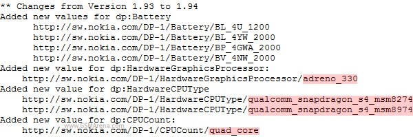 А сегодня на серверах Nokia был замечен не менее интересный файл, в котором упоминаются термины "4-ядерный", "adreno_330", "qualcomm_snapdragon_s4_msm8274" и "qualcomm_snapdragon_s4_msm8974".