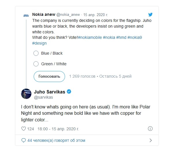 Данный твит заметил директор по продукции HMD Global Юхо Сарвикас (Juho Sarvikas) и сообщил, что предпочёл бы вариант Polar Night и некий новый, смелый окрас подобный тому, каким был в своё время медный Nokia 5.1, дебютировавший в 2018 году.