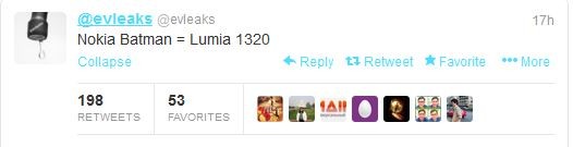 Nokia разрабатывает Lumia 1320 под кодовым именем "Batman"Известный twitter-аккаунт @evleaks на своей страничке в сервисе микроблогов сообщил, что финская компания Nokia разрабатывает новое устройство линейки Lumia, известное также под кодовым названием "Batman" —модель Lumia 1320.