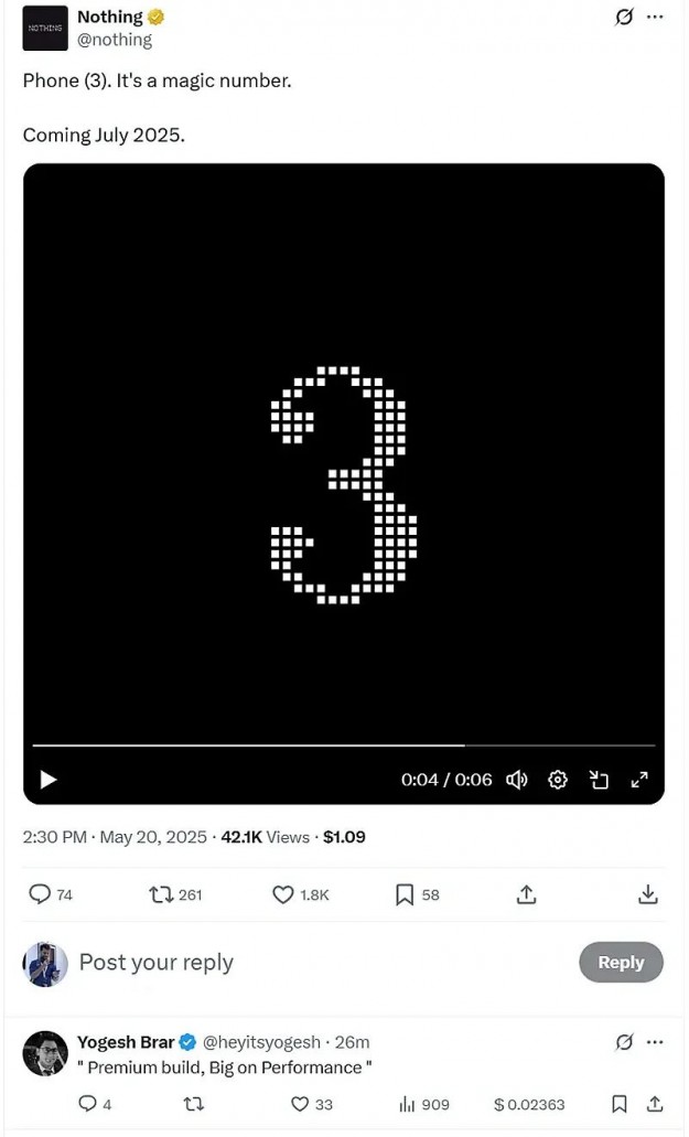 Анонс був зроблений у соціальній мережі X з коротким повідомленням «coming July 2025» і тизером, що базується на анімації цифри «3» у стилі dot-matrix, що нагадує шрифт фірмової оболонки Nothing OS. Як зазначає Android Authority, подробиць про сам пристрій у ролику не розкрили, проте відомий інсайдер Йогеш Бхар (Yogesh Brar) прокоментував публікацію фразою «Преміальна збірка, упор на продуктивність», натякнувши на характеристики преміального рівня. Джерело: SmartPhone.ua Обговорення новиниКоментариев пока никто не оставил. Станьте первым! Попередні новини