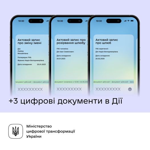 Розширюємо перелік цифрових документів у застосунку. Відтепер свідоцтва про народження, шлюб, розірвання шлюбу та зміну імені завжди у вашому смартфоні — у Дії. Більше не доведеться шукати оригінали, коли працевлаштовуєтесь, оформлюєте пільги чи підтверджуєте зміну прізвища.
