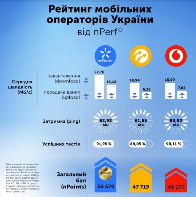 В ходе исследования, которое проводилось в период с 1 июля 2018 по 30 июня 2019, эксперты изучили результаты свыше 23 тысяч тестов работы мобильных сетей Украины. В частности, исследовалась скорость передачи и получения данных, стабильность соединений, быстрота загрузки веб-страниц, сохранение качества изображения при видео стриминге и др. Джерело: SmartPhone.ua Обговорення новиниКоментариев пока никто не оставил. Станьте первым! Попередні новини