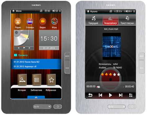 Новинки teXet возможно использовать как полноценный музыкальный центр: устройства воспроизводят аудио (MP3, WMA, OGG, APE, FLAC, AAC, WAV), имеют девять настроек эквалайзера и поддерживают ID3-теги. Благодаря отличной цветопередаче новые модели электронных книг могут выступать в качестве цифровых фоторамок. Ридеры поддерживают основные форматы графики (JPEG, BMP, PNG, GIF) и оснащены функцией просмотра изображений и фото в режиме слайд-шоу (в том числе с музыкальным сопровождением).