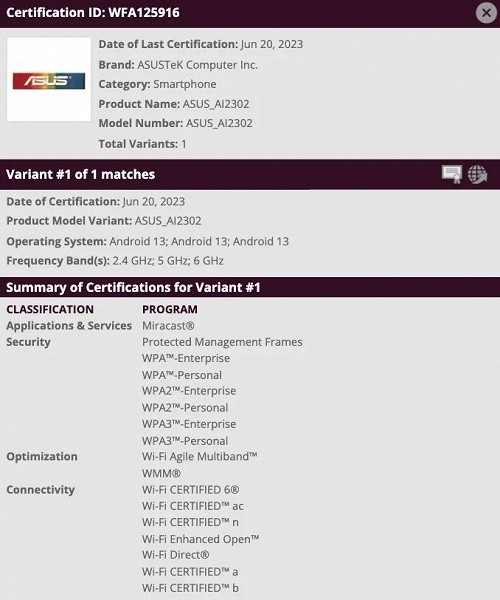 В Сети появились новые подробности о смартфоне Asus Zenfone 10. Аппарат засветился в базе Wi-Fi Alliance, и в перечне его характеристик указана поддержка трех диапазонов Wi-Fi – 2,4, 5 и 6 ГГц. Сертификация Wi-Fi Alliance – один из необходимых шагов перед выпуском аппарата.