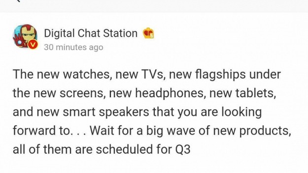 Об этом пишет китайский инсайдер, известный под ником Digital Chat Station. По его данным, в период с июля по сентябрь Xiaomi представит много всего нового: умные часы, телевизоры, флагманские смартфоны с подэкранной камерой (ждем Mi Mix 4, но могут быть и другие модели), наушники, планшеты (Mi Pad 5), умные колонки. Пока нет никаких характеристик, но по этому перечню видно, что станок Xiaomi будет работать на полную. Джерело: iXBT.com Обговорення новиниКоментариев пока никто не оставил. Станьте первым! Попередні новини