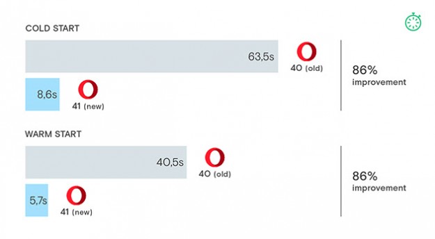 Новый браузер Opera запускается на 80% быстрееВ новой версии Opera появился интеллектуальный механизм запуска, благодаря которому наиболее важные вкладки загружаются теперь на 80% быстрее. На протяжении более 10 лет браузер Opera по умолчанию запускался в той вкладке, которую пользователь посетил последней в предыдущей сессии. Теперь с новым принципом последовательности запуска Opera открывается еще быстрее, отдавая приоритет закрепленным и недавно активным вкладкам. Благодаря приоритизации наиболее важных вкладок, большинство пользователей увидят почти мгновенную загрузку. Результаты тестов показывают, что при запуске браузера с более чем 42 открытыми вкладками скорость увеличилась в среднем на 86%. При 10 открытых вкладках, увеличение скорости составляет более 50%.