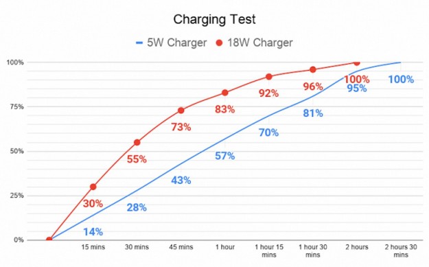 Итак, тесты показали, что с комплектным зарядным устройством iPhone SE заряжается за 15 минут до 14%, за полчаса — до 28%, за один час — до 57%, а на полную зарядку необходимо… два с половиной часа. Да, для зарядки аккумулятора ёмкостью 1821 мА·ч нужно два с половиной часа.