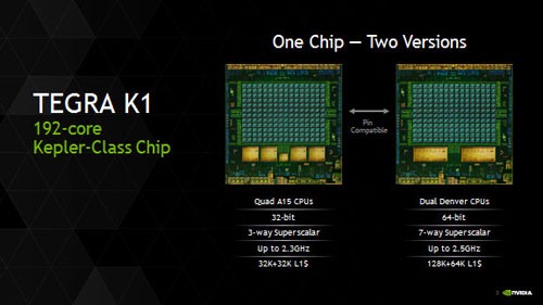 Nvidia объявила об анонсе 64-битного Tegra K1 для AndroidБуквально сегодня стало известно об анонсе компанией Nvidia 64-битного чипа Tegra K1 для платформы Android. В состав новинки вошли два ядра Denver, которые в отличие от 32-битной версии чипа работают на частоте 2,5 ГГц, а также 192-ядерная графика Kepler, обеспечивающая, согласно официальным данным, производительность, сравнимую с показателями современного ПК.