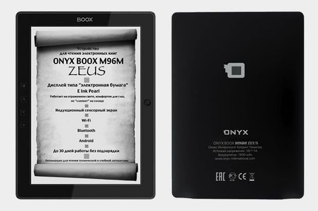 ONYX BOOX M96M Zeus - 9,7-дюймовый ридер на ОС AndroidМодель ONYX BOOX M96M Zeus оснащена 9,7-дюймовым сенсорным индукционным дисплеем E Ink Pearl с контрастностью 12:1, разрешением 825x1200 пикселей и антибликовым покрытием. Экран защищен обрамляющей металлической рамкой и стальной пластиной, расположенной за ним, дополнительную защиту обеспечивает чехол, который поставляется в комплекте с устройством. ONYX BOOX M96M Zeus оснащен процессором Freescale i.MX6 Solo Lite с тактовой частотой 1 ГГц, 512 МБ оперативной и 4 ГБ flash-памяти с возможностью использования карт памяти объемом до 32 ГБ, что примерно соответствует 32 000 книг, а аккумулятор емкостью 1600 мАч обеспечивает до месяца автономной работы устройства без подзарядки.