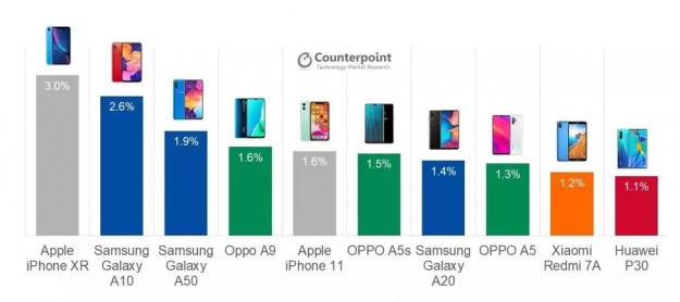 Издание Counterpoint опубликовало глобальный рейтинг самых востребованных смартфонов. Так, лидирующее место в списке наиболее популярных смартфонов занял iPhone XR, который на протяжении нескольких кварталов подряд остается наиболее покупаемым мобильным устройством в мире.