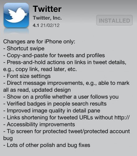 Обновление Twitter для iOSПоследнее обновление мобильного клиента сверхпопулярного сервиса микроблогов Twitter вызвало неоднозначную реакцию среди пользователей. Действительно, ведь обновление приложения подразумевает под собой добавление новых функций и устранение проблем. Но в случае с Твиттером все произошло почему-то наоборот. А что, собственно, произошло? Из-за общего изменения оформления Твиттера, доработки так же коснулись и iOS-версии клиента. И если версия для iPad не пострадала, то пользователям iPhone и iPod Touch досталось весьма сомнительного качества приложение. Привычный жест смахивания по твиту, который вызывал меню действий (ответ, ретвит, в избранное) куда-то пропал, вместо этого приходилось открывать твит в отдельном окне и уже там совершать с ним необходимые манипуляции. А функция копирования и вставки текста была вовсе забыта разработчиками везде, кроме окна создания твита, не говоря уже о нерационально расходуемом пространстве внутри самой ленты сообщений.