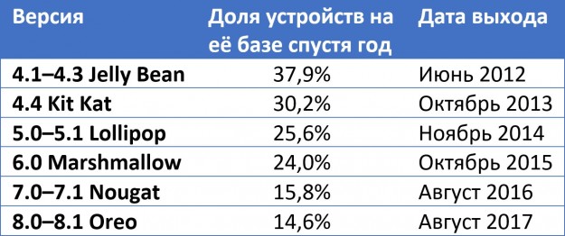Стоит отметить, что приведённые цифры отражают не только показатели выпуска производителями свежих обновлений. Они также показывают, как скоро свежие ОС становятся предустановленными на новых смартфонах и сколько времени требуется пользователям, чтобы купить новое устройство на замену старому. То есть показывают распространение свежих версий ОС в общем парке аппаратов Android за год.