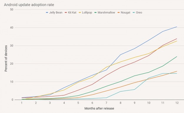 Обновления Android развёртываются всё медленнее, несмотря на усилия GoogleПоследняя версия Android 9 была выпущена в августе 2018 года. В октябре, через 81 день после выхода, когда Google опубликовала свою последнюю общедоступную статистику, эта версия ОС не была установлена даже на 0,1 % устройств. Предыдущая Oreo 8, выпущенная в августе 2017 года, работала на 21,5 % устройств через 431 день после запуска. Спустя продолжительные 795 дней после выпуска Nougat 7, большинство пользователей Android (50,3 %) всё ещё оставались на более старых версиях ОС.