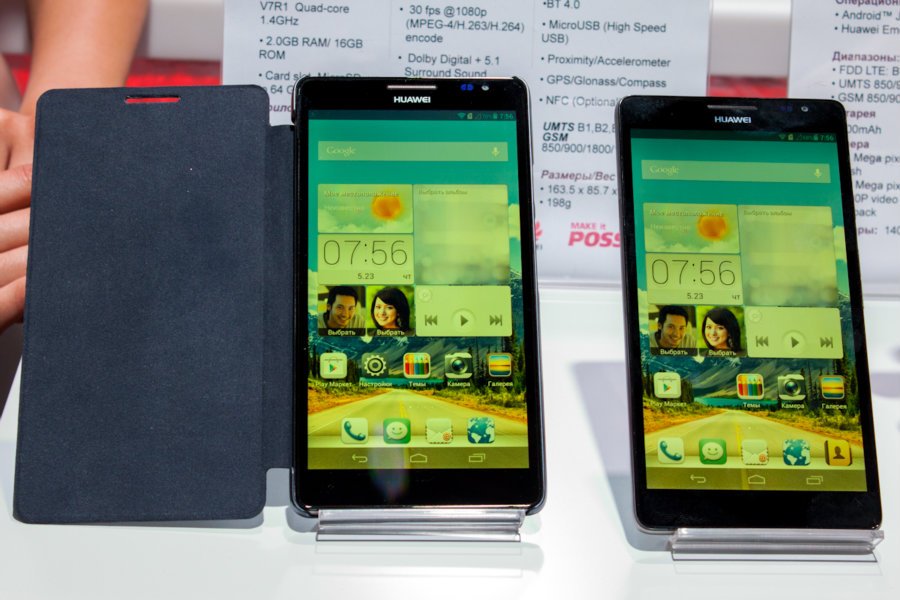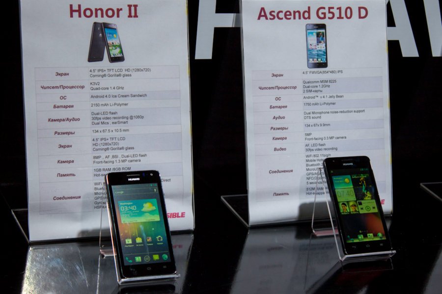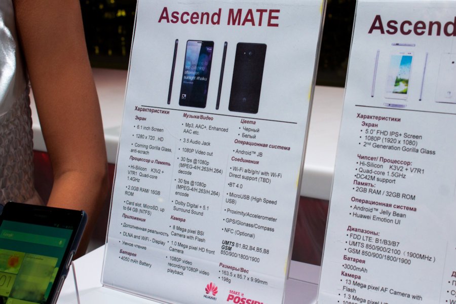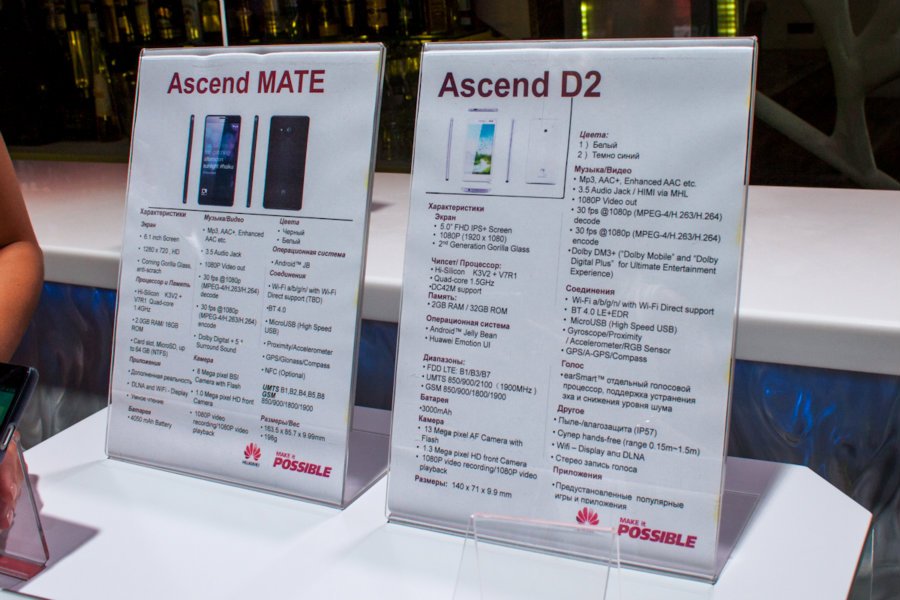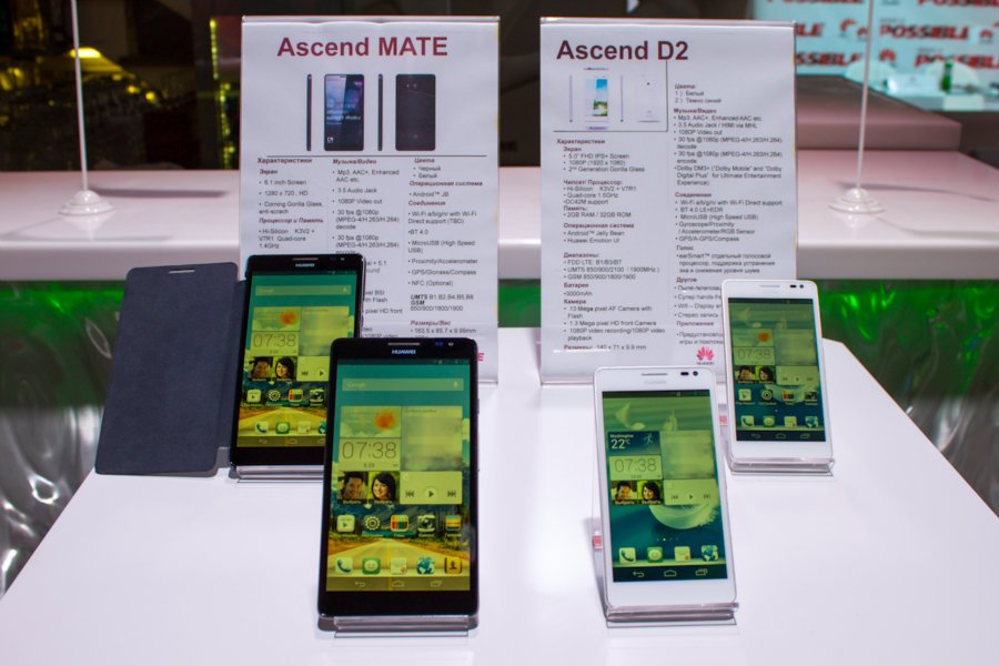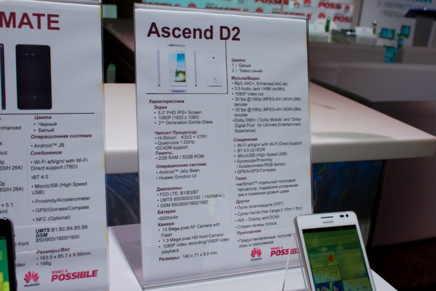 Объявлены цены на Huawei Ascend D2 и Ascend Mate в УкраинеКомпания Huawei провела презентацию обновленной линейки своих Android-смартфонов серии Ascend 2013 года. Модели Ascend D2 и Ascend Mate поступят в продажу уже в следующем месяце в сетях MOYO и Rozetka. Чем хороши 5-ти и 6.1-дюймовый смартфон, их технические характеристики и цены читайте далее. Имея значительный опыт продажи своих устройств через сети мобильных операторов Life и Киевстар, с этого года компания Huawei активно начинает продвижение своей продуктовой линейки на розничном рынке. Пользователям предлагается довольно широкая гамма телефонов на одну и две сим-карты c экранами от 3,5 до 6,1 дюймов и различными по производительности аппаратными платформами. На презентационных стендах были показаны модели Honor II, G510 D, Y300 D, Y210 D и, конечно же, Ascend D2 и Ascend Mate. Именно в них компания воплотила свои лучшие наработки и достижения. К ключевым инновациям стоит отнести быструю возможность подзарядки (на 20% быстрее конкурентов) и технологию энергосбережения собственной разработки QPC+ADRX (Automated Discontinuous Reception), позволяющей держать заряд на 30% дольше аналогов. Кроме этого, Ascend D2 и Ascend Mate могут обмениваться данными по Wi-Fi на скорости до 150 Мбит/с, а два встроенных микрофона позволяют делать стереозапись в отличном качестве. Есть что сказать и об интерфейсе Emotion UI, который установлен поверх ОС Android 4.1 на обоих устройствах. Что из заявленных инновационных решений действительно заслуживает внимания, мы проверим на реальных образцах в наших обзорах уже совсем скоро. Ниже поделимся с вами первыми впечатлениями об этих телефонах. Huawei Ascend D2 - приятный для руки смартфон с экраном на 5 дюймов. Дисплей выполнен по технологии Super Retina и имеет разрешение 1080*1920 точек при плотности пикселей 443 на дюйм. Картинка на экране контрастная и насыщенная. Обод корпуса выполнен из металла, задняя крышка у смартфона в белом цвете глянцевая, экран прикрыт защитным стеклом Corning Gorilla Glass. Само устройство имеет защиту от попадания пыли и влаги по стандарту IPX 5/4. Встроенная батарея на 3000 мАч, по заявлению производителя, обеспечивает до 12 часов работы при интенсивных нагрузках. При средних нагрузках производитель обещает, что Ascend D2 будет на связи гарантированно в течение 2-х дней. И это при том, что аппаратно внутри четырехядерный процессор на 1,5 ГГц, отдельный графически чип и 2 ГБ оперативной памяти. Встроенной памяти - 32 ГБ, чего должно хватить и для музыки, и для видео с фотографиями. Последние можно делать основной 13 МП камерой либо же фронтальной на 1.3 МП. Huawei Ascend Mate - большой смартфон. Такой большой, что пользоваться им одной рукой действительно тяжело. Это устройство предлагается как альтернатива Samsung Galaxy Note2, но при этом имеет 6.1-дюймовый дисплей с более рациональным соотношением размеров экрана и рамки. Такие габариты и аппаратная начинка, в основе которой аналогичный модели Ascend D2 процессор с немного другим графическим чипом и 2 ГБ оперативной памяти, требуют и соответствующего аккумулятора. В этом плане в Huawei не скромничали и оснастили устройство батареей на 4050 мАч. Заявлено, что этого будет достаточно на 17 часов работы в режиме разговора, 11,5 часов серфинга в Сети и почти 9-ти в режиме просмотра видео. Как будет на самом деле, проверим в ближайшее время в наших обзорах. Там же постараемся оценить и качество снимков основной камеры на 8 МП. Программно Mate дополнили панелью 