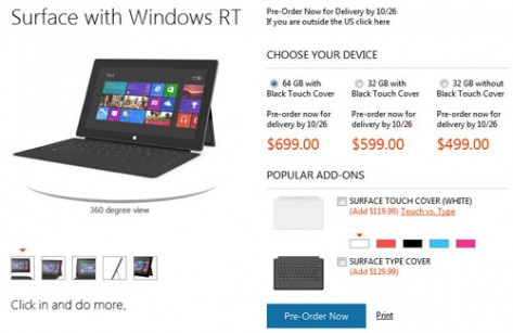 Объявлены официальные цены на планшет Microsoft Surface RT в различных модификацияхНаконец-то Microsoft объявила о начале предварительных заказов на планшет Microsoft Surface RT. Какая же ценовая политика производителя? Самая простая версия устройства с 32 ГБ встроенной памяти обойдется пользователям в $499. Отдельную «сотку» придется выложить сразу же или $119 попозже, в случае, если пользователь захочет иметь не только Microsoft Surface RT, но и докинговую стацию, выполненную в форме клавиатуры.
