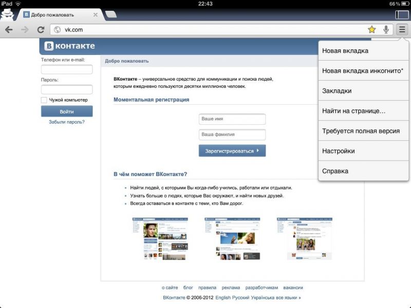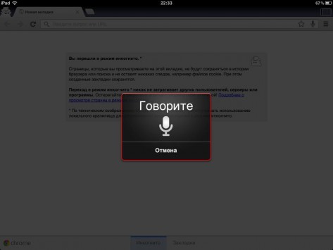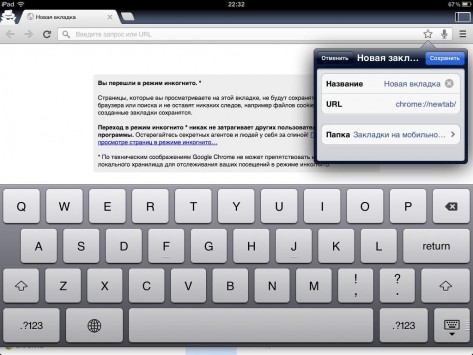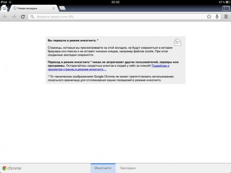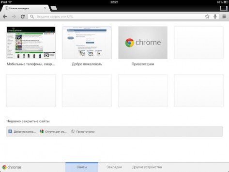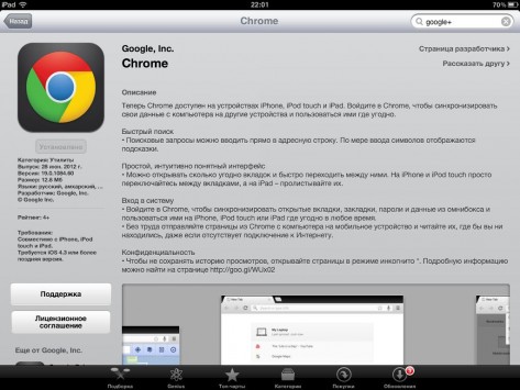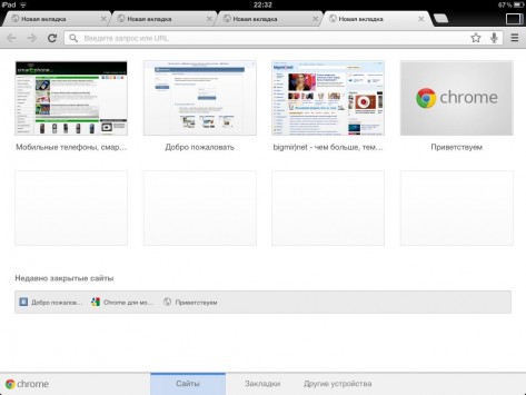 Обзор браузера Google Crome под iPadСамое последнее обновление браузера Google Crome под планшет iPad, смартфон iPhone и плеер iPod. Последняя сборка. Рассматриваем все «за» и «против» этого обозревателя. Объем дистрибутива в App Store занимает чуть меньше 13 МБ. При наличии хорошего Wi-Fi либо 3G-подключения (смотря, чем богато ваше устройство, и какое соединение предпочитаете использовать), загрузка и установка браузера - дело нескольких десятков секунд. Активировав браузер пользователь попадает на некую страницу-приветстивие, где система предлагает перенести из компьютера на мобильное устройство свои открытие закладки и прочее. Пользователь может проделать предлагаемую манипуляцию, но точно также может этим и не заниматься – зависит исключительно от желания и необходимости в данного рода действии. Стоит также отметить и то, что внизу этой страницы-приветствия обустроены некоего рода подразделы. Что они собой представляют, догадаться несложно, хотя бы уже из их названия. Изучая эти подпункты, несложно увидеть, что с самого начала, как только пользователь запустит обозреватель, система «переведет» его на подпункт «Другие устройства»! В сущности, что «умеет» этот подпункт, я уже описал, добавить как такого попросту нечего. Что же относительно подпункта «Закладки», перейдя сюда, пользователь получает доступ ко всем созданным ранее закладкам, причем как к мобильным версиям, так и полноформатным. И, наконец, подраздел «Сайты». Здесь имеется некая панель быстрого доступа к различным ресурсам Сети (ярлыки формируются и располагаются автоматически, в зависимости от того, насколько часто посещается тот или ной ресурс). Чуть ниже устроена панель, в которой фиксируется история последних посещенных ресурсов. Как по мне, ни первое, ни второе в дополнительных комментариях и объяснениях не нуждается. Подобно браузеру Opera Mini, да и без исключения всем другим обозревателям под iPad, браузер Google Crome поддерживает работу в режиме нескольких одновременно активных окон. Сколько можно открыть окон, не говорится, однако лично я, во время осмотра возможностей обозревателя, открывал их не менее десяти. Работа комфортная, но главное стабильная.