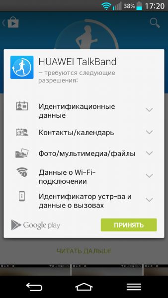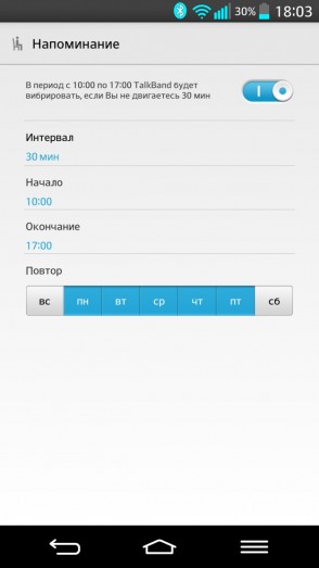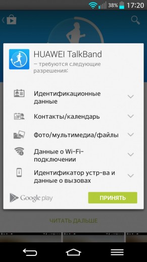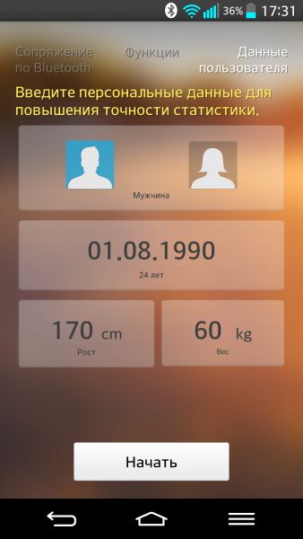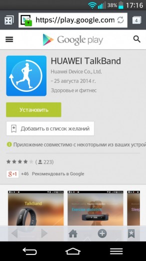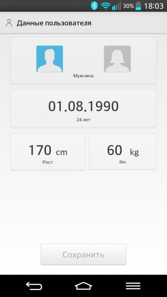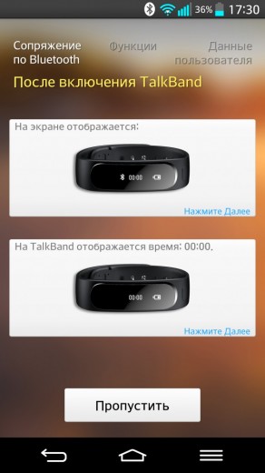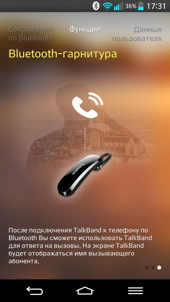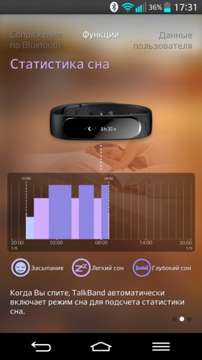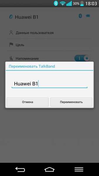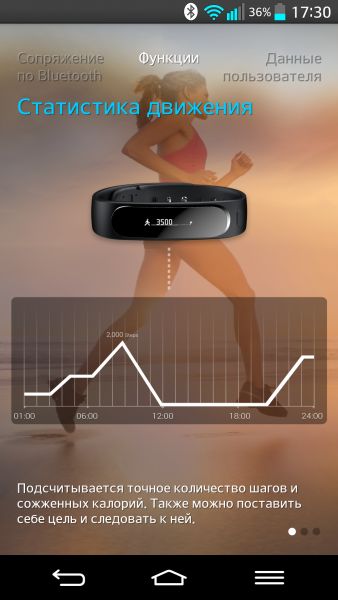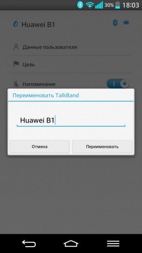 Кроме того, осматривая стенки, пользователь увидит два обозначения QR-кода. За одним из них «спрятана» ссылка на WEB-страничку с дополнительной информацией о новинке, а за другой адрес страницы на Google Play с приложением Huawei TalkBand. О его особенностях далее. Внешний вид и функциональные элементы Сразу же стоит отметить, что браслет TalkBand B1 состоит из двух частей - самого ремешка, а также каплевидного аппаратного блока. И первый, и второй, согласно заверениям производителя, получили защиту корпуса по стандарту IP57, то есть от пыли и воды. Назвать его ключевым преимуществом перед конкурентами, конечно же, нельзя, однако за наличие его здесь все равно спасибо. Сам по себе ремешок силиконовый - с гибкостью здесь все в полном порядке, как, впрочем, и с креплением на руку. Последнее, кстати говоря, рассчитано совершенно на любую кисть, даже школьника, что также плюс! В устройстве используется 1,4-дюймовый изогнутый дисплей, в основе которого OLED-матрица. О разрешении его официально не упоминается. Стоит отметить довольно крупные пиксели и существенное «вымирание» отображаемых данных при работе с браслетом «на солнце». Впрочем, лично я как таковой проблемы не вижу, особенно с учетом формата отображаемых здесь данных - белые цифры и символы на черном фоне. Отмечу также и то, что дисплей не сенсорный. Однако проблем с навигацией это не доставляет. Доступ к данным гарантирует аппаратная кнопка, обустроенная на ребре. А вот нажав на вторую, можно отделить дисплейную часть от непосредственно самого ремешка. Ну и стоит, наверное, добавить, что на рынке это устройство будет доступно в трех цветовых решениях, что по логике вещей должно покрыть все потребительские предпочтения в этом плане. Особенности приложения Huawei TalkBand и подключение Установка приложения выполнялась на смартфон LG G2, обзор которого выходил у нас на портале ранее. Для заинтересованных вот ссылка! В сущности можно сканировать уже упомянутый QR-код с дальнейшим выбором смартфона и установкой утилиты, а можно поступить даже немного рациональнее - отыскав необходимую утилиту по поиску на Google Play. Сопряжение со смартфоном у TalkBand B1 возможно как посредством Bluetooth, так и NFC-модуля. Никаких действий на самом браслете выполнять не нужно, достаточно лишь включенного питания. Далее запускаем модуль на смартфоне и ждем. Подключение происходит автоматически. Открыв приложение впервые, пользователь сразу же «наткнется» на небольшого «гида», который расскажет об особенностях Huawei TalkBand. Далее вам будет предложено ввести персональные данные. Последние, как заявляют разработчики, нужны для того, чтобы повысить точность статистики. При необходимости эту информацию, конечно же, можно менять из подменю настроек. Кроме того, здесь же доступна возможность переименовать модуль браслета в точности, так как это делается с любым другим «синим зубом», изменить уже упомянутые данные пользователя, а также установить цели (необходимое количество сожженных калорий за день и пройденных шагов), напоминание, активировать «умный» будильник, а кроме того, узнать подробнее о самой программе.