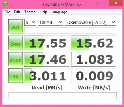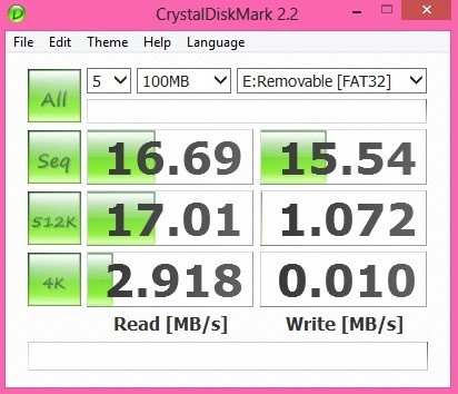 Внутри коробки, кроме карты памяти в специальном пластиковом футляре, а также уже упомянутого картирдера, предусмотрена полная инструкция по настройке и использованию плюс некоторая другая документация. Внешность Осматривая Transcend Wi-Fi SD (32ГБ), найти, как говорится, 10 отличий от обычного накопителя формата SD у пользователя не получится. Все, что отличает эту «флешку» от классической - наличие надписи Wi-Fi на наклейке на передней панели. Она то и подсказывает о ключевой отличительной черте аксессуара. Помимо упомянутого, здесь же имеются данные об объеме накопителя, классе скоростей и пр. На противоположной панели аксессуара пользователь встретит лишь технические обозначения: данные о стране-производителе аксессуара, маркировку и др. В Украине, помимо рассматриваемой в этом обзоре 32 ГБ версии накопителя, доступна также 16 ГБ версия. За 32 ГБ пользователю придется заплатить в районе 520 гривен, а за 16 ГБ - 380. С учетом возможности беспроводной передачи контента, а также картридера в комплекте поставки мне такая цена кажется вполне оправданной. Скорости В этом разделе статьи я решил изучить скорости записи/считывания информации во время подключения Transcend Wi-Fi SD (32ГБ) к штатному картридеру, а также к встроенному в мой рабочий ноутбук. Ниже смотрим показатели, «зафиксированные» при помощи Crystal Disk Mark 2.2. - при подключении к «штатному»картридеру