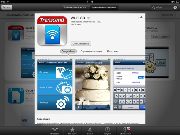 В первом реализована возможность просмотра контента, хранящегося в памяти Transcend Wi-Fi SD (32ГБ).