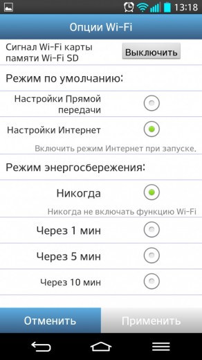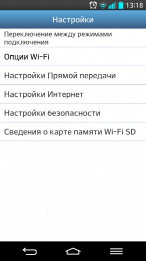 Из этого подменю доступна возможность переключения с режима «Передача контента между устройствами» на «Передача контента в Сеть». Кроме того, из этого же раздела пользователь получает возможность работать с настройками безопасности, настройками Интернета, посмотреть «Сведения о карте памяти Wi-Fi SD» и многое другое.
