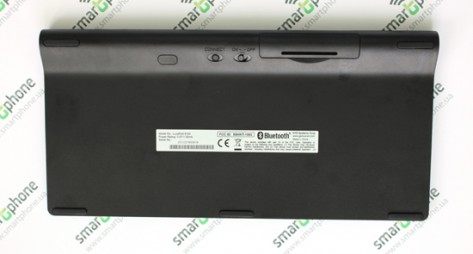 Нижняя же панель, более практическая, получила матовый тип материала. По периметру имеется несколько прорезиненных вставок, уготованных специально для того, что бы клавиатура не ездила по столу или другому предмету, на котором ее разместит пользователь. Помимо насадок, здесь же расположены две функциональные кнопки, а также отсек для пальчиковых аккумуляторов или батареек. Надо отдать должное - производитель красиво решил вопрос с тем, что бы клавиатура получила определенный наклон, предав одному из торцов девайса некую овальную форму. Таким образом, и наклон имеется, и блок под аккумулятор не выглядит никакой «белой вороной».