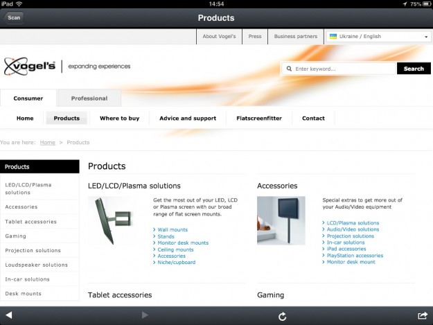 Обзор комплекта креплений для iPad Vogels RingO TMS 304Изучаем новый набор аксессуаров, ориентированных на использование в «дуэте» с планшетом iPad. Насколько же удобно при помощи Vogels RingO TMS 304 установить iPad на столе, закрепить на стенке и даже зафиксировать на задней части автомобильного подголовника!? Упаковка и комплект поставки Для Vogels RingO TMS 304 уготована картонная коробка, на стенках которой пользователь увидит, конечно же, иллюстрацию самого набора креплений, фотографии, демонстрирующие использование комплекта в различных условиях, а также данные о компании-производителе и изображение QR-кода. При помощи последнего производитель «скрывает» дополнительную информацию об аксессуарах и прочих продуктах. Внутри коробки, скажем так, «уютно» упакован холден, а также устройство для крепления на стенку либо же, проще говоря, настенный кронштейн. Также здесь есть крепление на автомобильный подголовник и подставка на стол, плюс вкладыш-инструкция и защитная пленка на планшет. За последнее, уверен, пользователи Vogels RingO TMS 304 скажут отдельное спасибо, поскольку покупка защитной пленки, как правило, «вытягивает» из кармана покупателя не одну сотню дополнительных гривен (зависит от фирмы, качества и т.д.). Качество материалов Основное, скажем так, устройство, которое будет задействовано пользователем независимо от варианта крепления планшета – это холден. С виду он похож на некий щит, который крепится на планшет к тыльной его части, создавая, таким образом, необходимые условия для защиты как этой стороны корпуса, так и боковых граней планшета. Материал изготовления холдена, по меньшей мере, тактильно напоминает пластик soft touch. Как снаружи, так и изнутри на прикосновение он «мягкий», а на самой панели фактически не остается отпечатков пальцев или более того, густых маслянистых разводов. Ну а те, что иногда «проскакивают», легко вытираются уже, что говорится, в «два-три маха». На внутренней части корпуса пользователь увидит небольшую наклейку с различного рода технической информацией об устройстве. Примерно по центру обустроена некоего рода прорезь, изнутри обрамленная алюминиевым ободом. Вот сюда уже крепится настенный кронштейн, настольная подставка или же автомобильный подголовник. Основа корпуса в автомобильном креплении – крепкий матовый пластик. К качеству сборки претензий никаких. Но с учетом того, что пользователю здесь придется работать с отверткой, было бы неплохо увидеть ее в комплекте поставки. А вот корпус настенного кронштейна изготовлен главным образом из алюминия, правда, есть и пластик. Последний материал реализован в виде скоб, при помощи которых к кронштейну крепится холден. Кстати, в начале я не говорил, но в комплекте поставки специально для настенного крепления есть и «штатный» саморез. Мелочь, но приятно. И, наконец, подставка на стол! Она получила монолитный глянцевый корпус, а также крепление с захватом для холдена. Сборка и установка Общая для всех трех вариантов креплений деталь – холден. Независимо от того, устанавливаете ли вы свой iPad на стол, крепите его на стенку или заднюю часть автомобильного подголовника, без холдена вам не обойтись. Установка планшета сюда занимает всего секунду-полторы времени. Фиксация надежная – произвольно планшет не выскользнет – факт. Разумеется, крепление холдена немного увеличит то